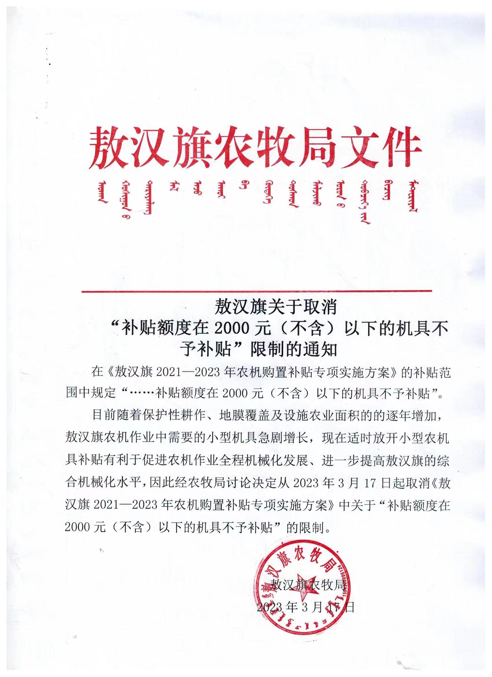 敖汉旗关于取消“补贴额度在2000元(不含)以下的机具不予补贴”限制的通知