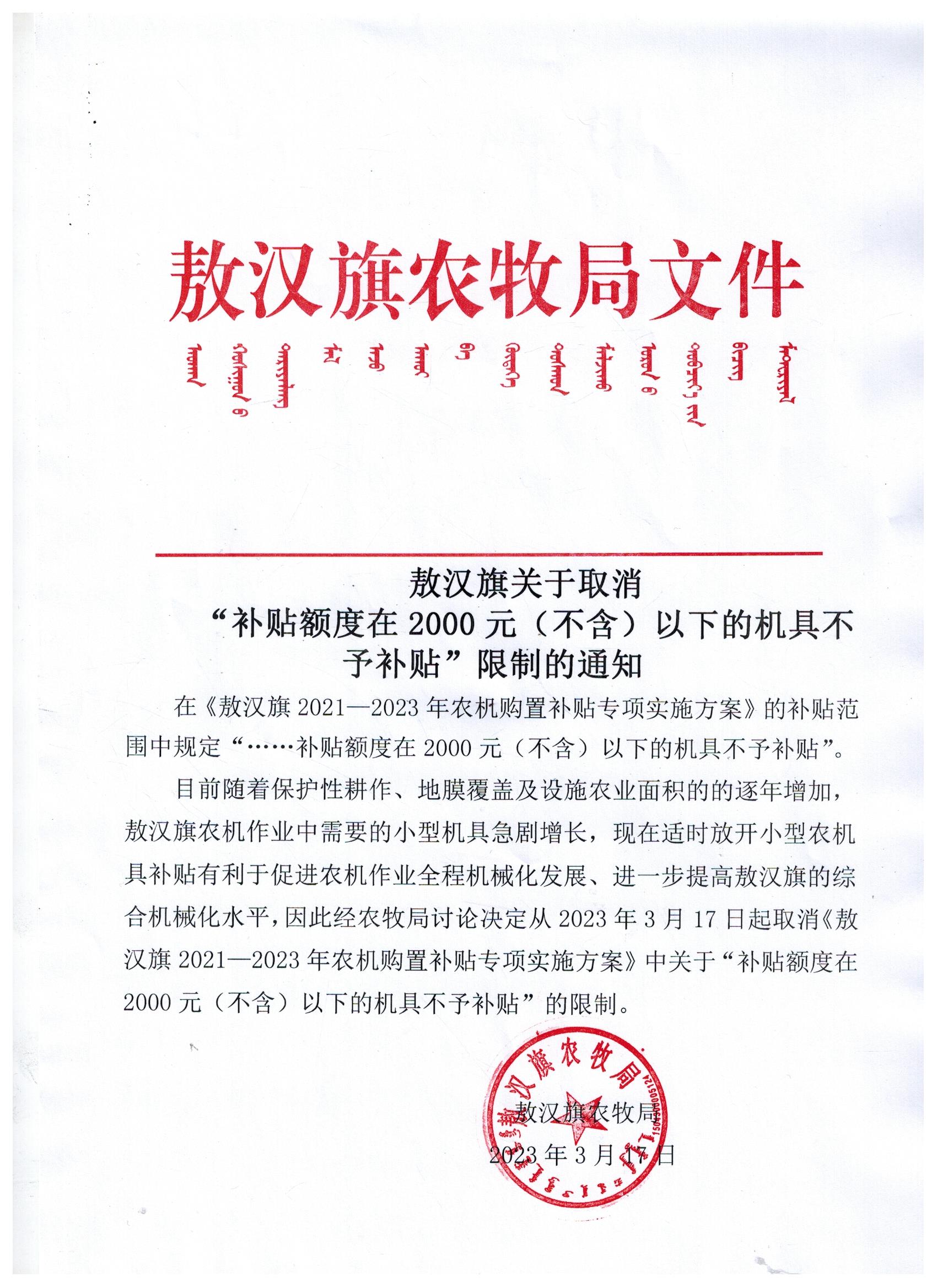 敖汉旗关于取消“补贴额在2000元(不含))以下的机具不予补贴”限制的通知