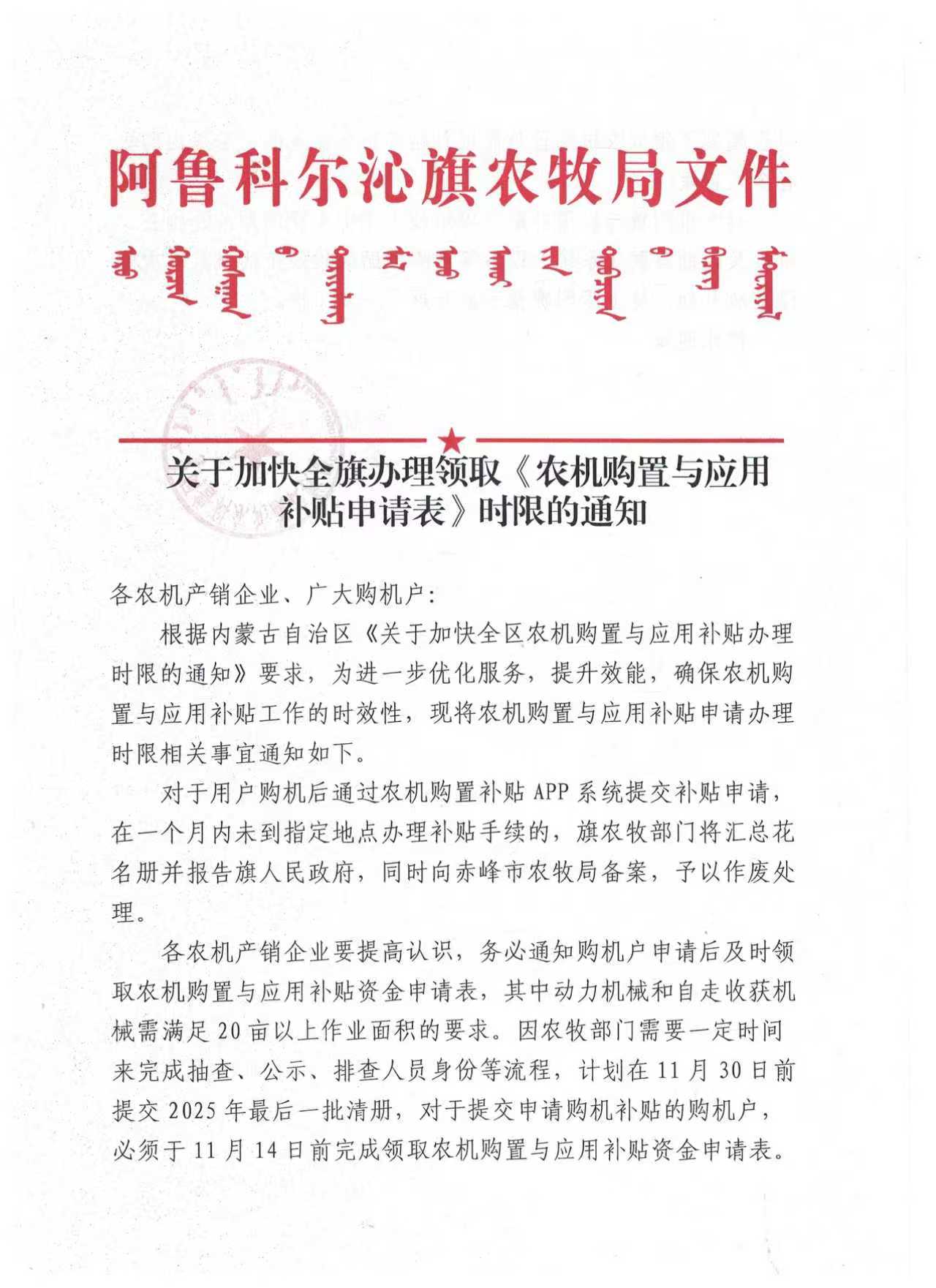 关于加快全旗办理领取《农机购置与应用补贴申请表》时限的通知