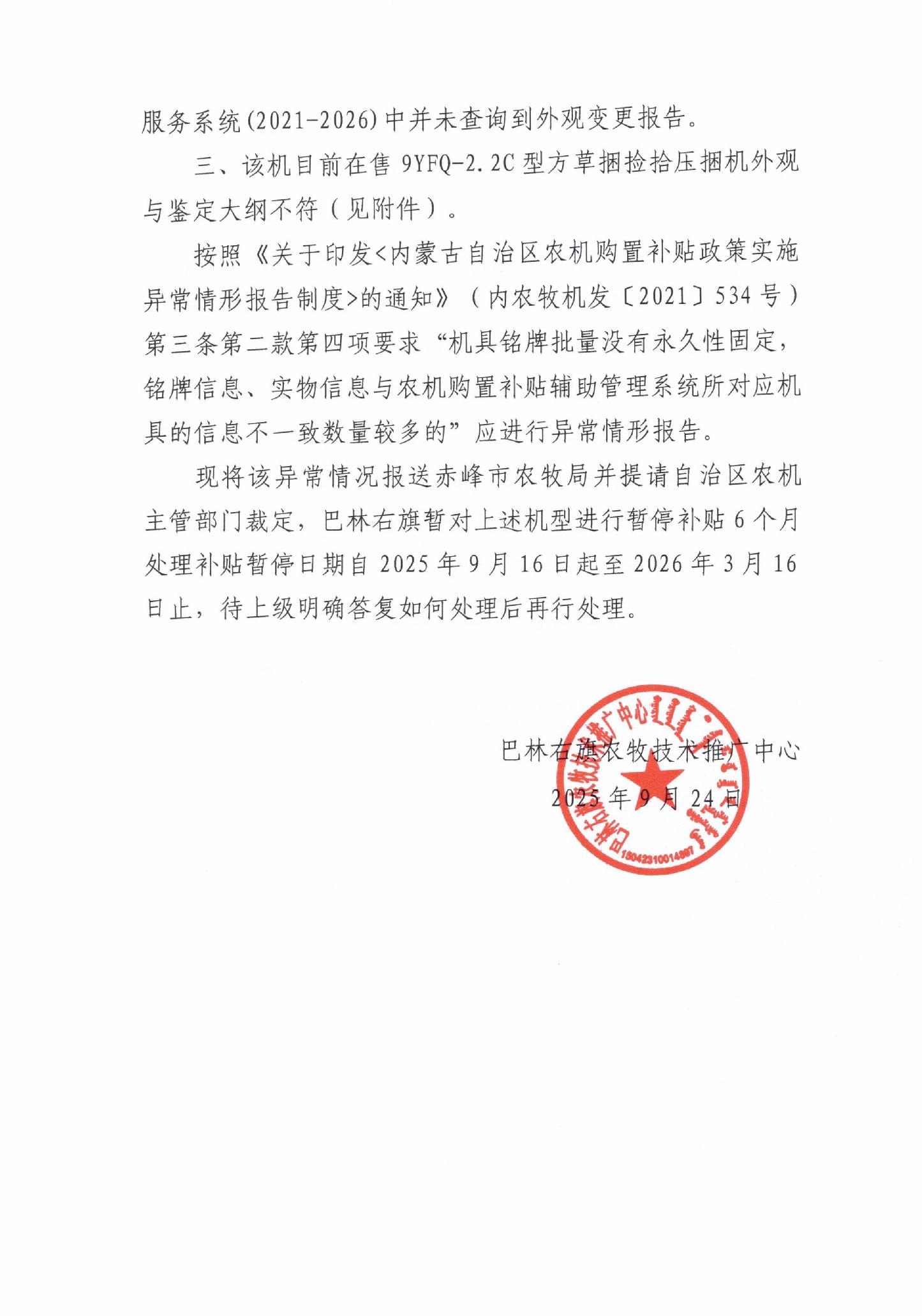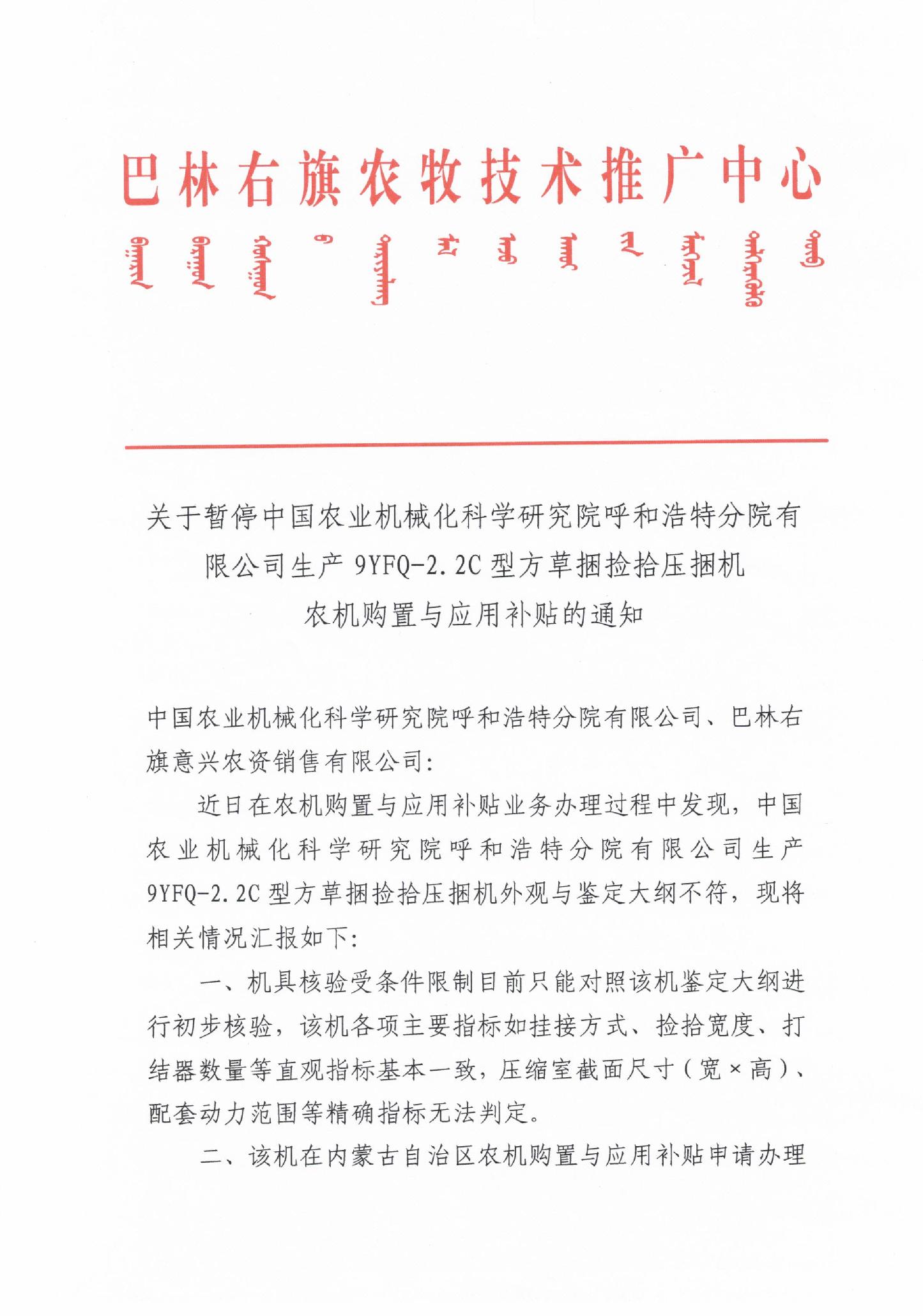 关于暂停中国农业机械化科学研究院呼和浩特分院有限公司生产9YFQ-2.2C型方草捆捡拾压捆机农机购置与应用补贴的通知