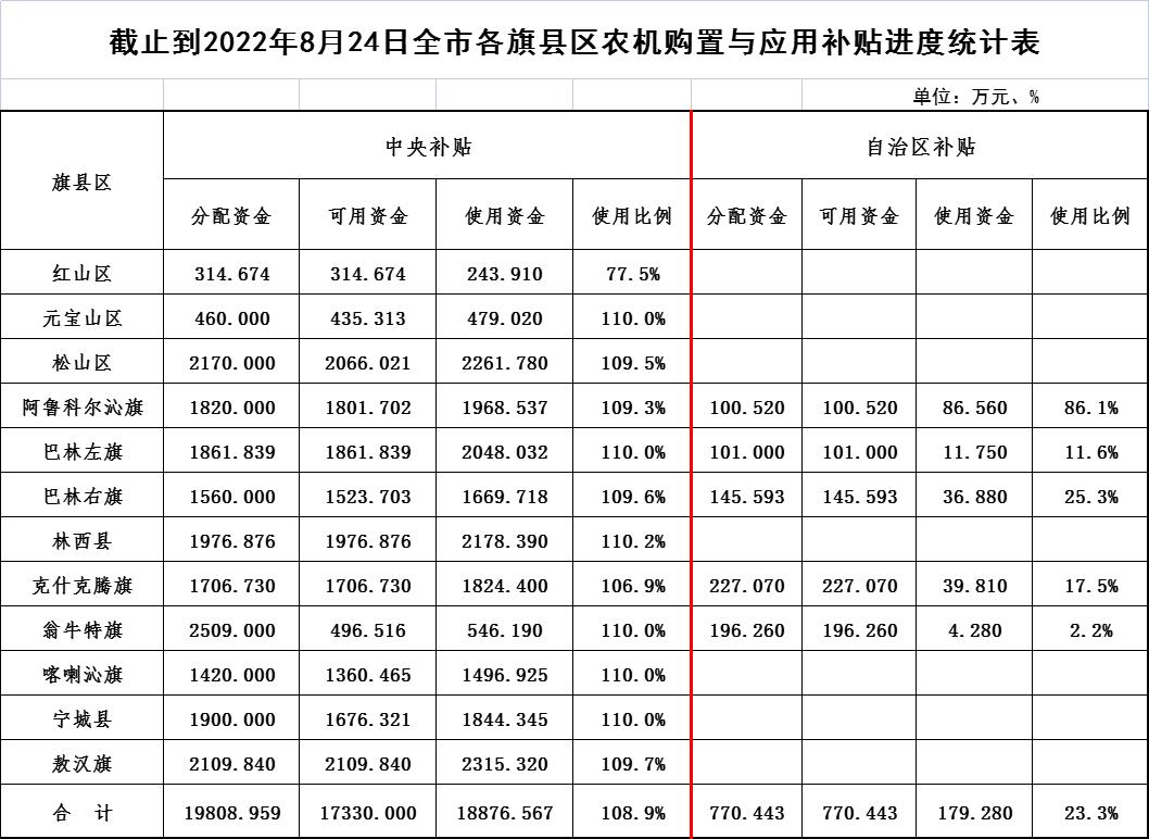 截止到2022年8月24日全市各旗县区农机购置与应用补贴进度统计表