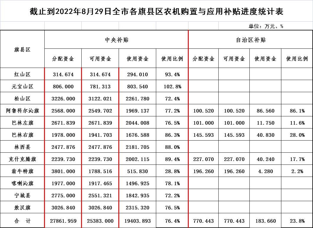 截止到2022年8月29日全市各旗县区农机购置与应用补贴进度统计表