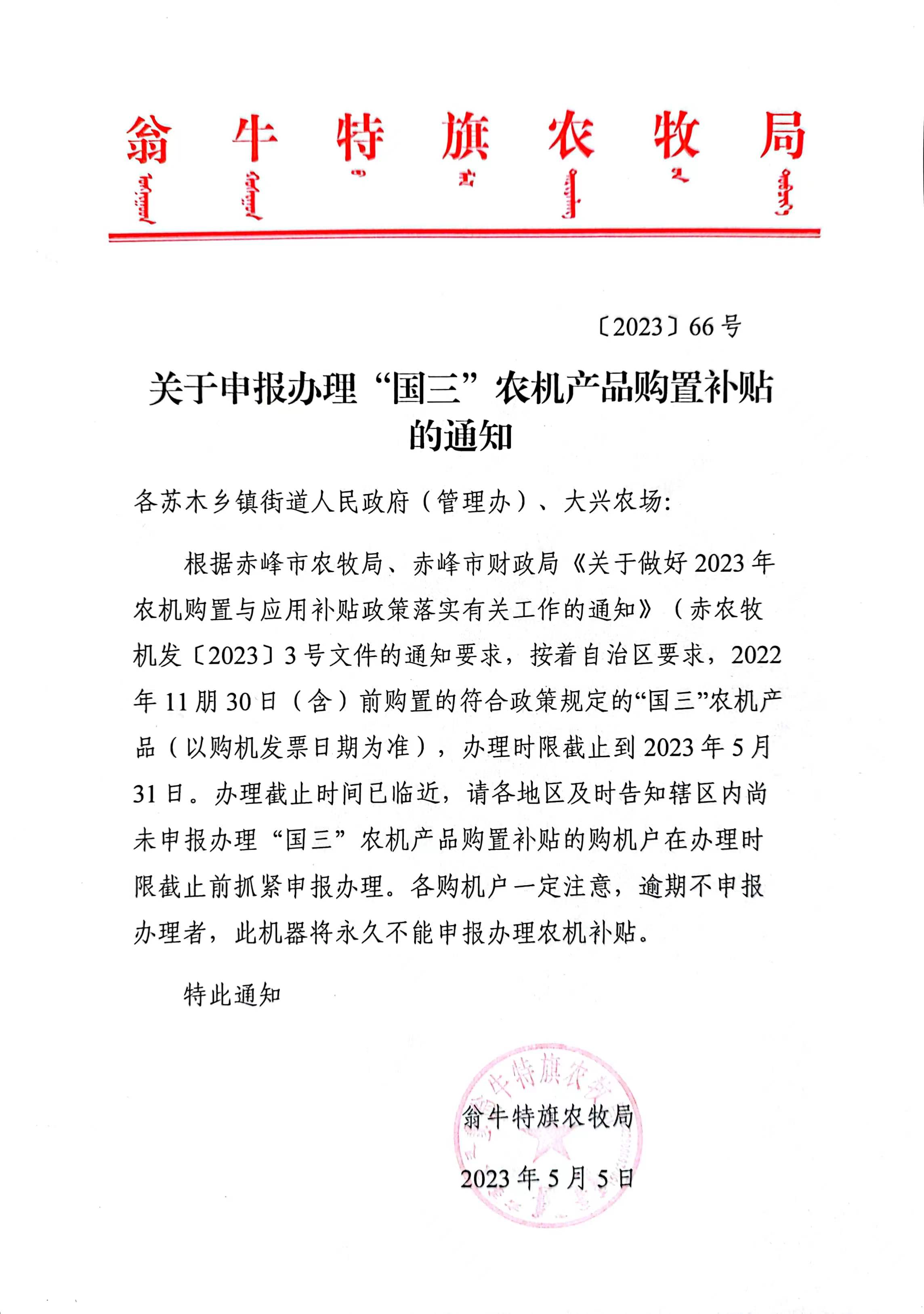 关于申报办理“国三”农机产品购置补贴的通知