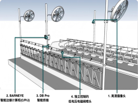 动物感知层。基于颈枷区域立柱上每隔 12 米一台的高清摄像机实时捕捉牛群位置,划定动态喷淋区域(如采食区、 休息区),仅牛只进入时触发喷淋。