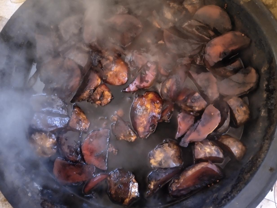 烀好的咸菜疙瘩房子用树条编的大筐里,放在外窗台上暴晒,四五天后,用纳鞋底的细麻绳穿起来挂在晾衣杆子上或者房檐底下,慢慢晒干。家里人来回走过,特别是小孩,总会揪下来一个咬上几口。过段时间晾的差不多了,就该收起来了,这时候的咸菜疙瘩,比当初刚腌制时候碗口大的芥菜小了好几圈,又瘦又小的,外表析出的盐在阳光下还闪着亮光,可切开后里面却是黑红色的,很是诱人,这就是芥菜疙瘩的最终成品,咸疙瘩。