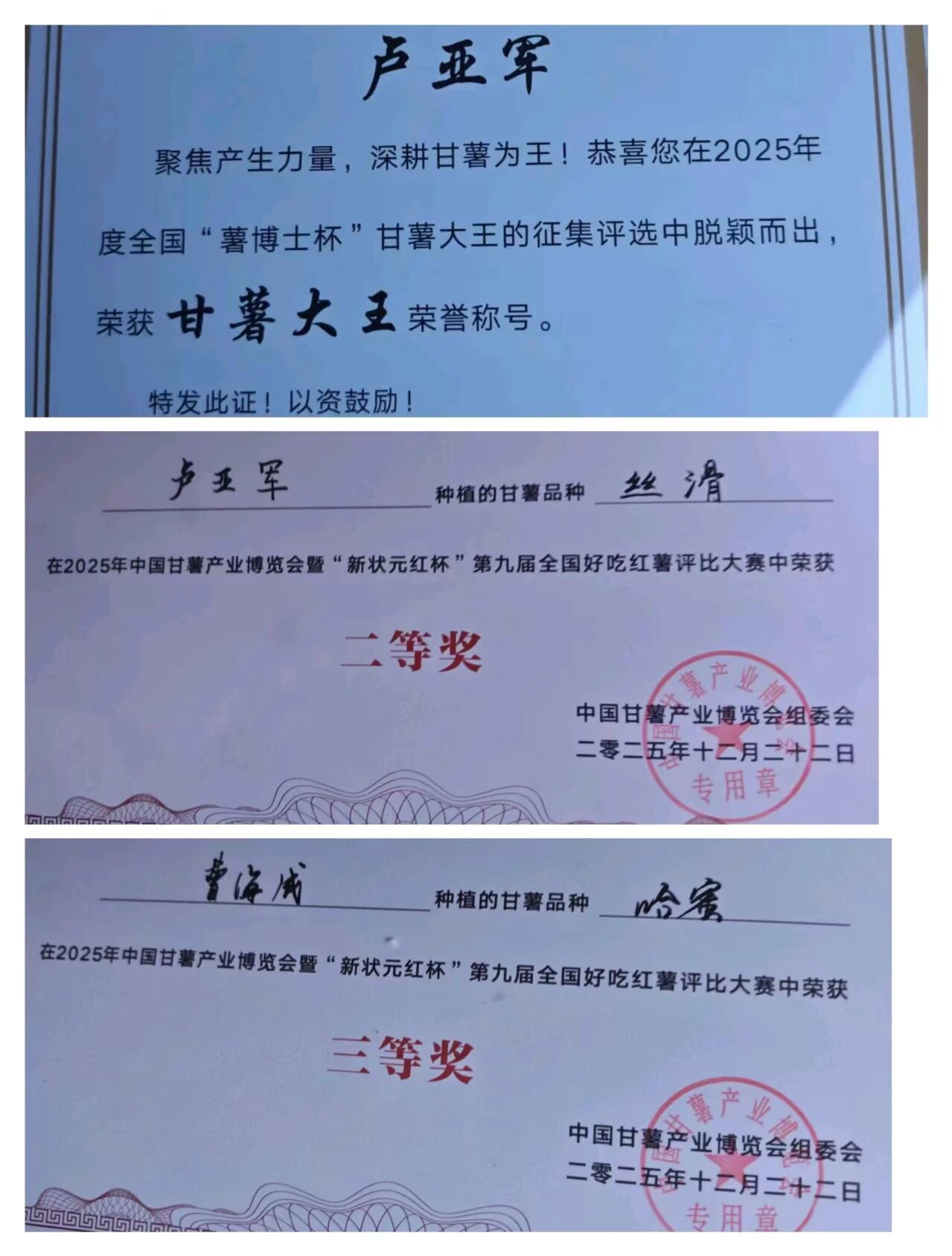 12 月 22 日,2025第七届中国甘薯产业博览会在郑州中原国际博览中心圆满落幕,敖汉旗兴隆洼镇种植大户卢亚军、曹海成携“宝国吐地瓜”参赛,从全国20余个省份的百余家参赛主体中脱颖而出,斩获多项国家级大奖,让这座“地瓜小镇”的特色产业再添闪亮名片。