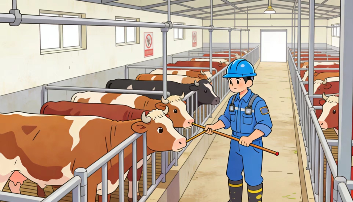 牲畜凭动物检疫证明入场,工人佩戴安全帽、防滑靴,温和引导畜禽进入待宰圈,禁止暴力驱赶。