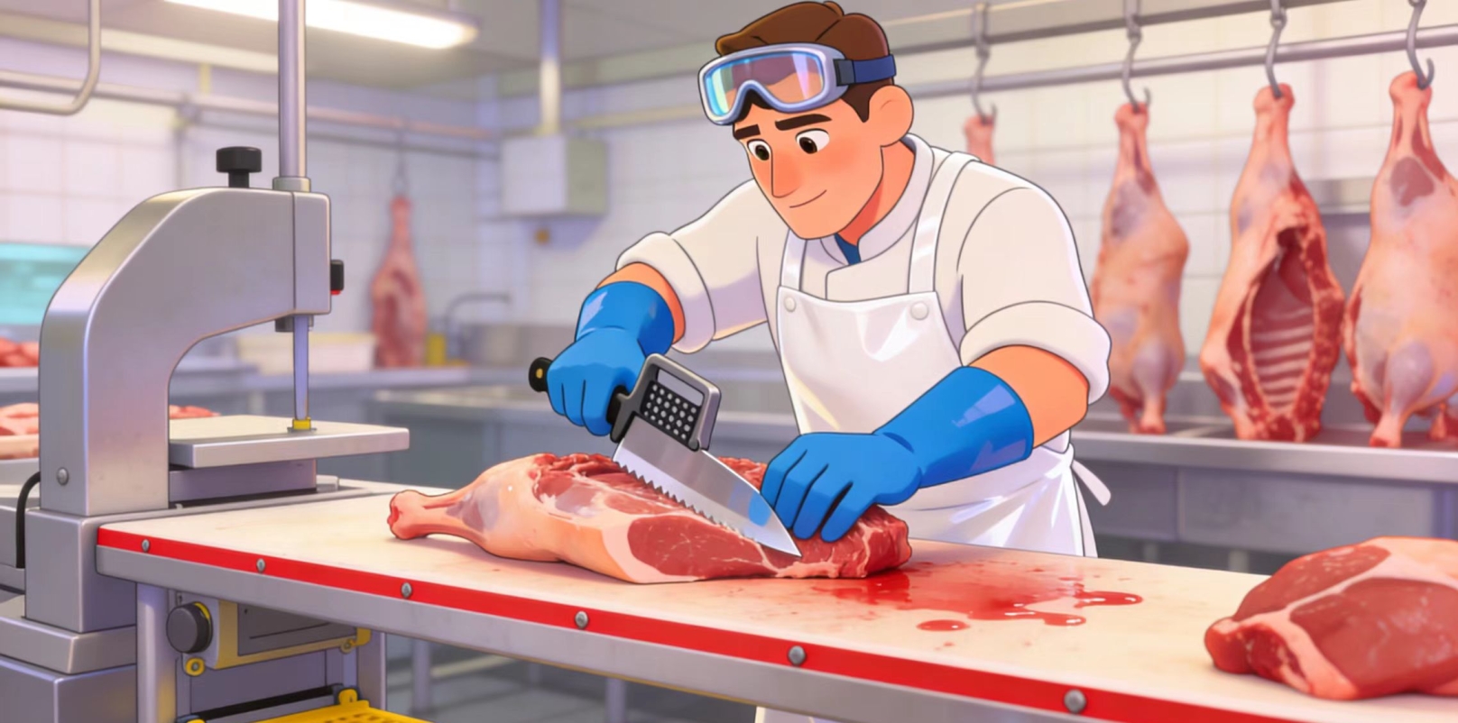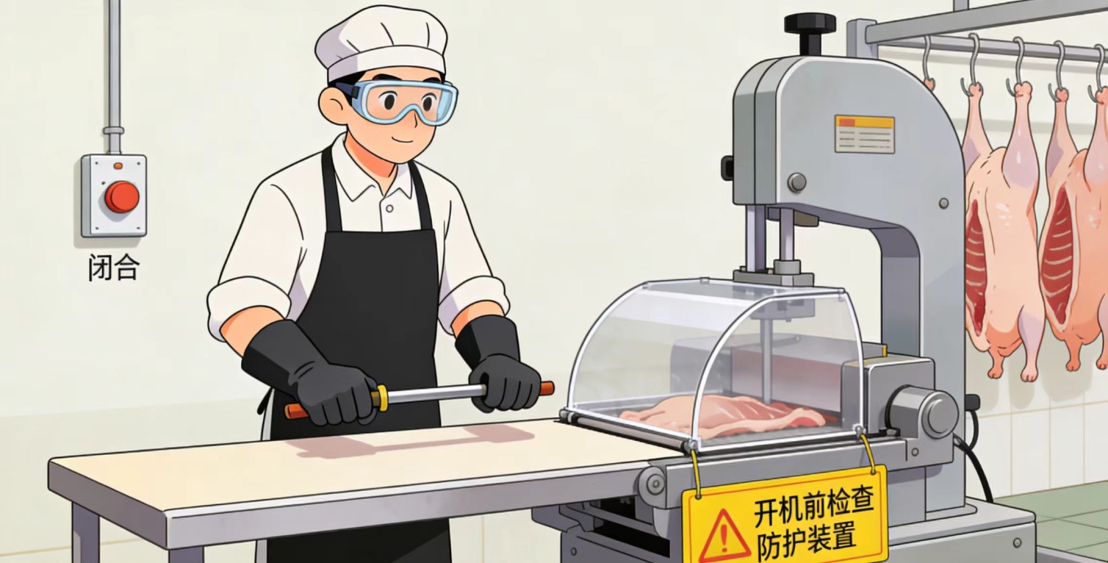 工人穿戴全套防护装备(防切割手套、护目镜、防水围裙),操作台下方设置防滑踏板,分割完毕刀具统一收回专人管理,防止造成人员伤害。