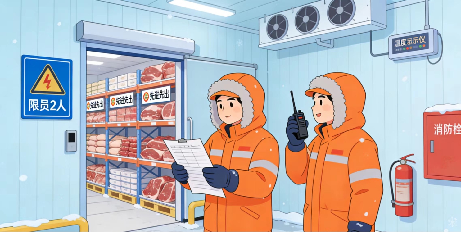 工人穿防寒服进入冷库,库内货物堆码整齐不遮挡消防设施,配置报警器,门口张贴“限员2人”标识。