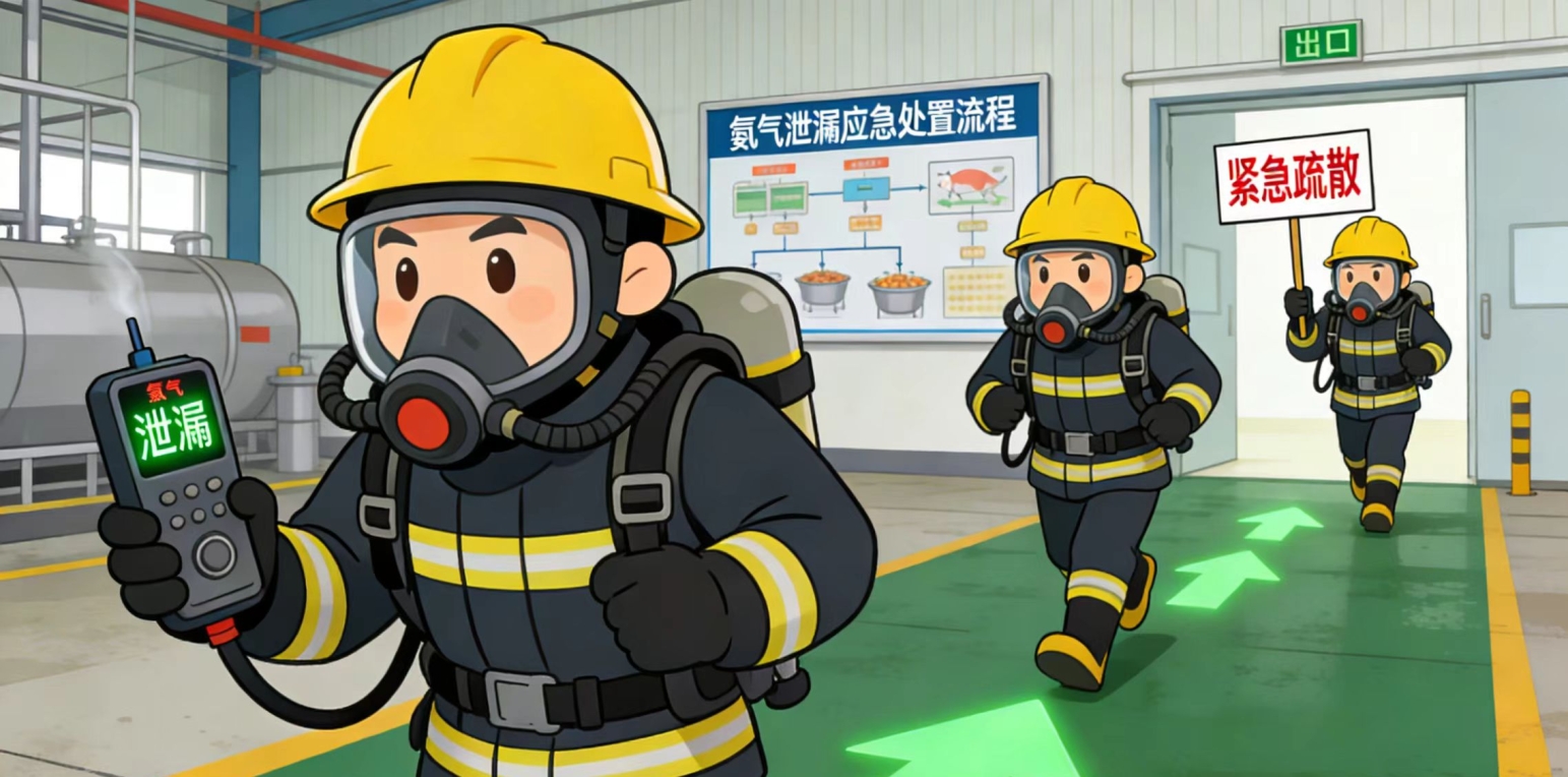 制定应急预案,配备应急防护物资,开展应急演练:模拟氨气泄漏场景,工人佩戴正压式呼吸器,按疏散路线引导人员撤离。
