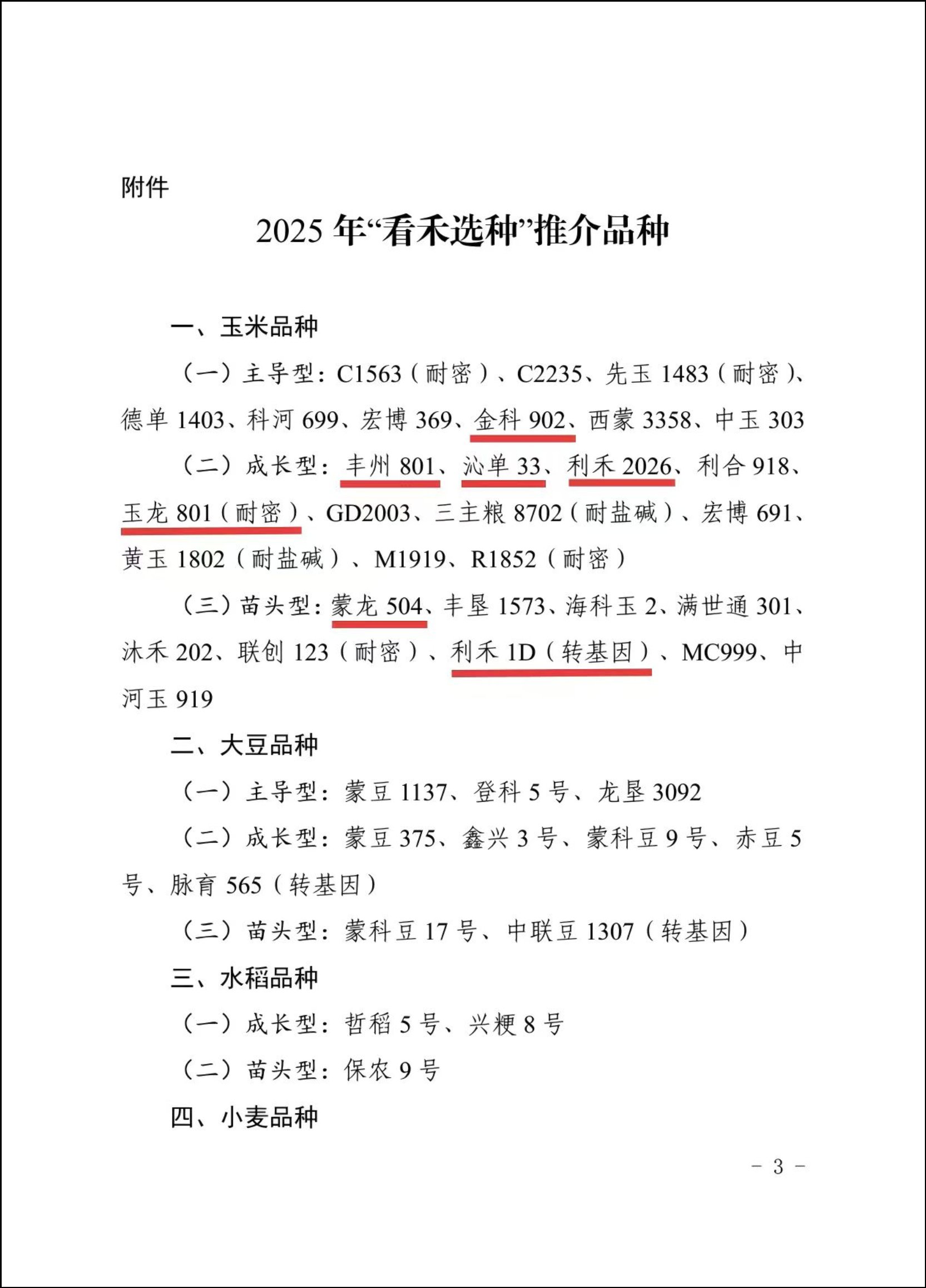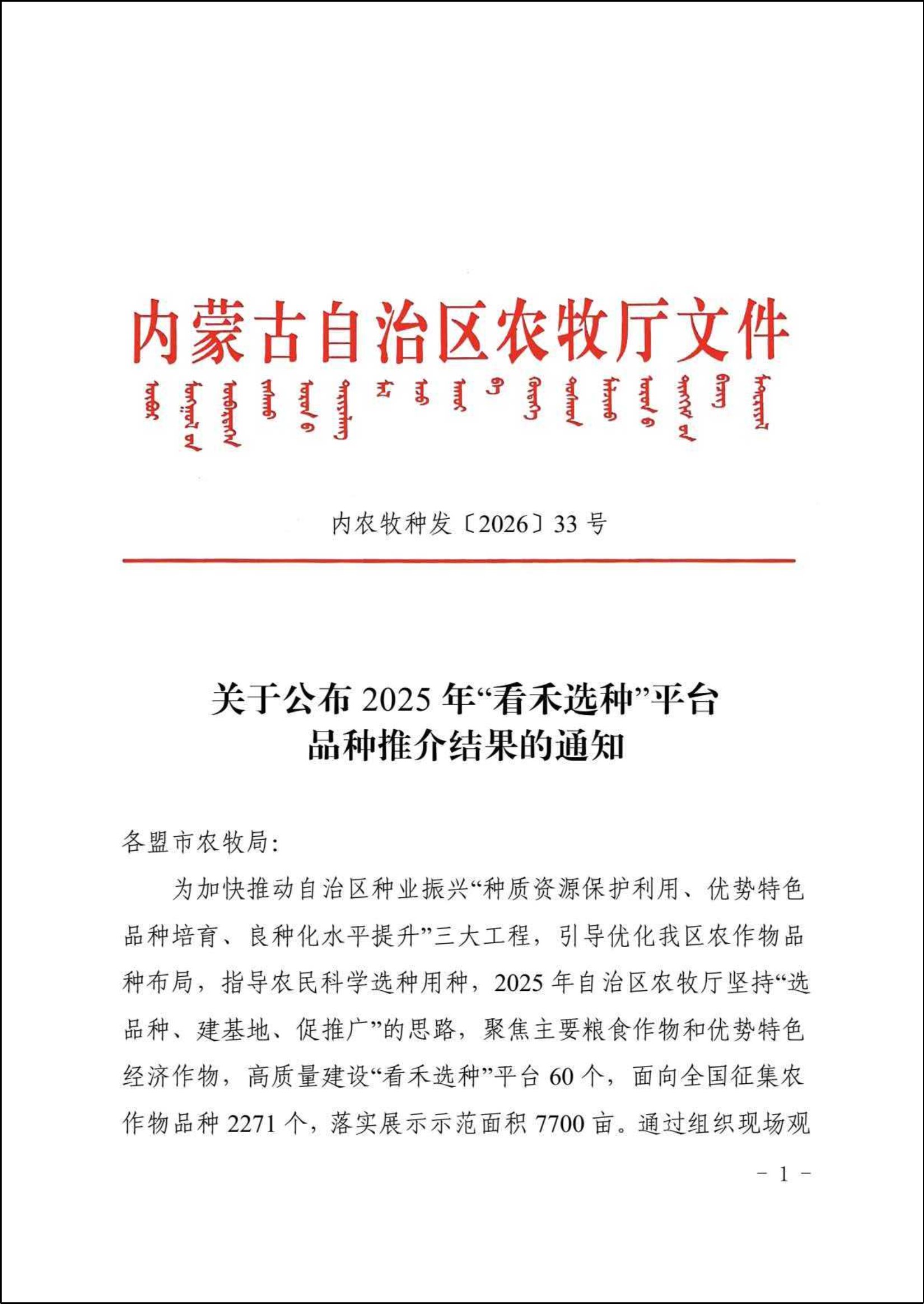 粮食安全乃“国之大者”。“良种”是实施单产提升、守护粮食安全的关键。2025年内蒙古自治区坚持“选品种、建基地、促推广”的思路,聚焦主要粮食作物和优势特色经济作物,高质量建设“看禾选种”平台60个,面向全国征集农作物品种2271个,展示示范面积7700亩。在现场观摩、跟踪评价、实收测产、专家论证的基础上,经盟市推介和专家评审,最终筛选出适宜全区不同生态区域推广的优良玉米品种29个,其中内蒙古利禾农业科技发展有限公司育成的利禾2026和利禾1D(转基因)、翁牛特旗玉龙种子有限公司育成的丰州801和玉龙801(耐密)、内蒙古蒙龙种业科技有限公司育成的蒙龙504、内蒙古金葵艾利特种业有限公司育成的金科902、喀喇沁旗三泰种业有限公司育成的沁单33等7个赤峰市育种单位自主选育的玉米品种入选2025年内蒙古自治区“看禾选种”推介品种。